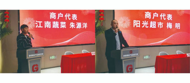 商戶代表江南蔬菜總經(jīng)理朱源洋、陽光超市董事長梅明發(fā)表了講話。