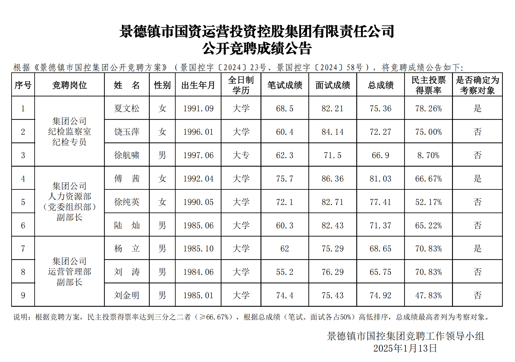 景德鎮(zhèn)市國資運營投資控股集團有限責(zé)任公司公開競聘成績公告
